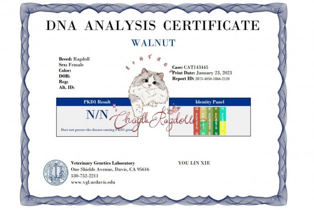 DNA檢測每一位貓爸爸貓媽媽在回國之後除了有台灣獸醫基礎血液檢驗指數正常、傳染病檢驗陰性(貓愛滋、貓白血、貓瘟、梨形鞭毛蟲)以外,還有送檢國外生技公司遺傳病檢驗布偶貓容易號發遺傳病(PKD、HCM)陰性後,才進行繁育後代,進而嚴格把關寶寶健康品質。
