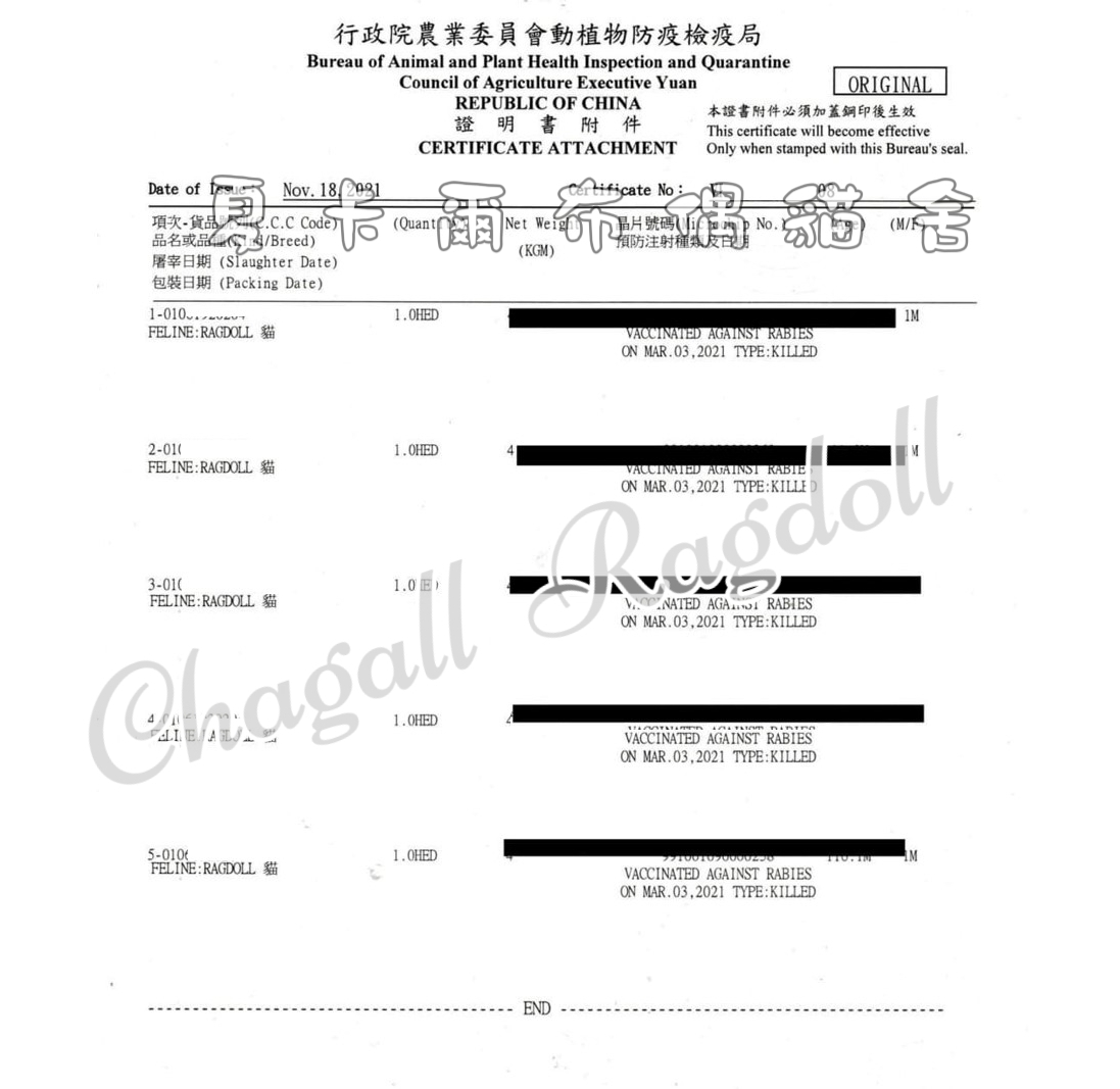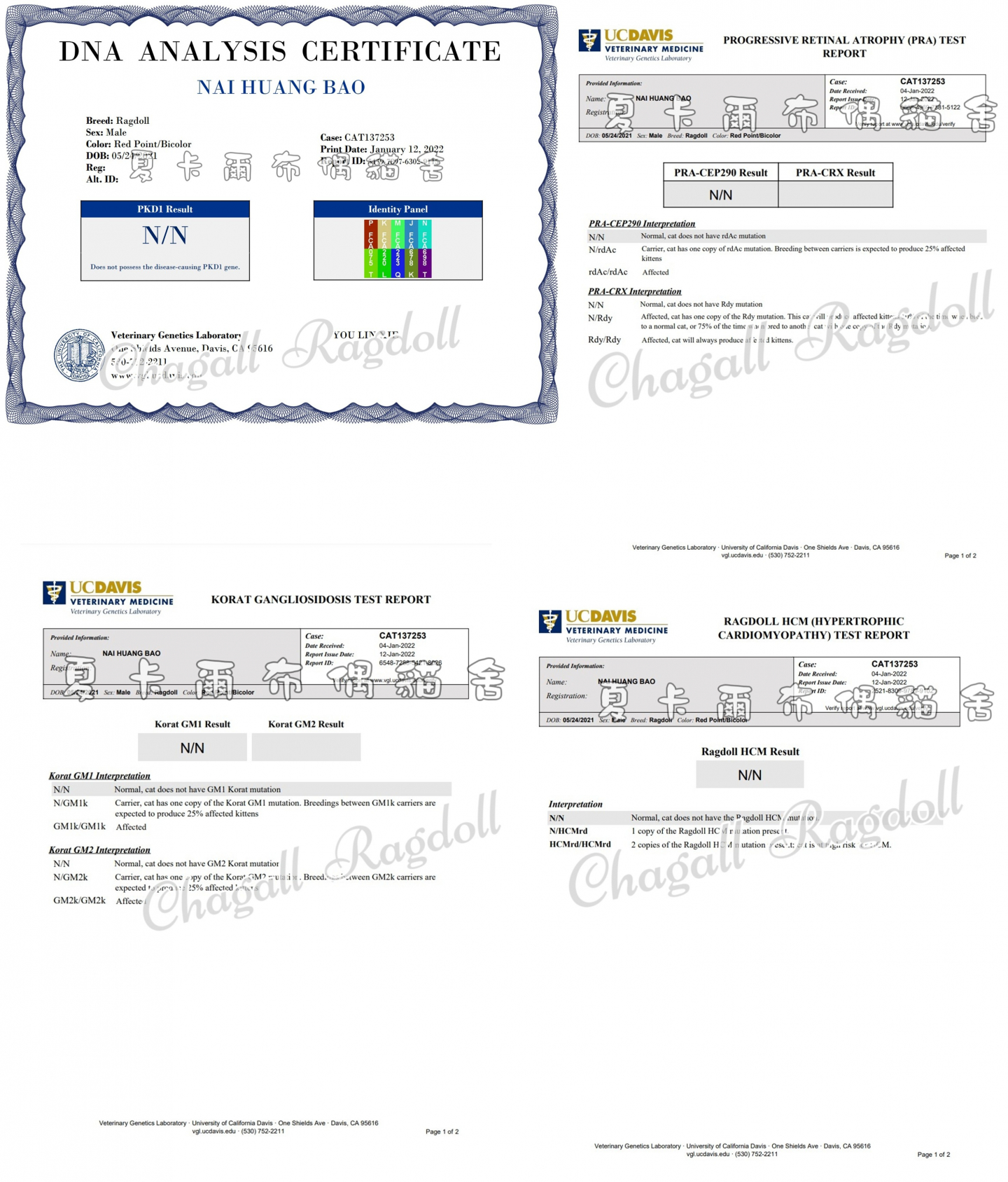每一位貓爸爸貓媽媽在回國之後除了有台灣獸醫基礎血液檢驗指數正常、傳染病檢驗陰性(貓愛滋、貓白血、貓瘟、梨形鞭毛蟲)以外,還有送檢國外生技公司遺傳病檢驗布偶貓容易號發遺傳病(PKD、HCM)陰性後,才進行繁育後代,進而嚴格把關寶寶健康品質。